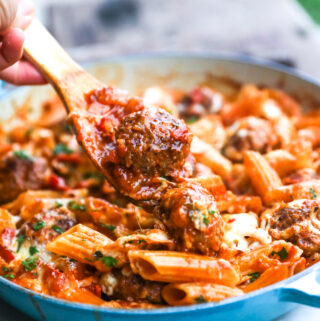 This is one of those get-dinner-on-the-table recipes that saves the day. You can use store-bought meatballs or make your own ( if you have time), and the rest of the recipe uses basic pantry staples and one pan, and it’s always a hit with kids and adults alike. It’s perfect for busy weeknights when energy is low but hunger is high.
